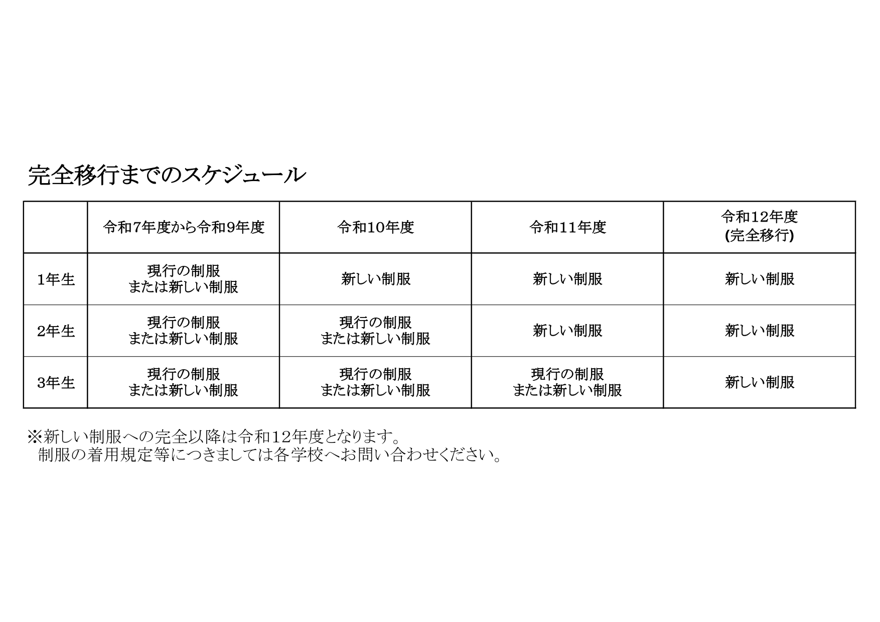 新しい制服への完全移行は令和12年度です。完全移行までのスケジュールは下記の通りです。