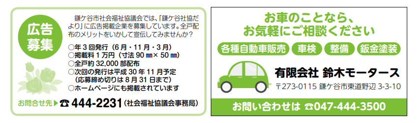 鎌ケ谷市社会福祉協議会では、「鎌ケ谷社協だより」に広告掲載を希望する企業の募集を始めています。