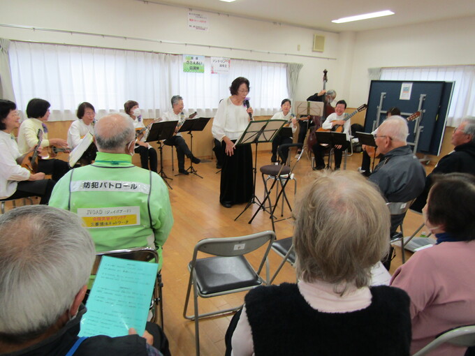 令和7年11月13日「南部ささえあい協議体ミニ講座」は東中沢自治会館にてマンドリン演奏会を開催。受所・東中沢地区の皆さんに、保健師さん指導のストレッチとアコード マンドリン アンサンブルさんの演奏を楽しんでいただきました。